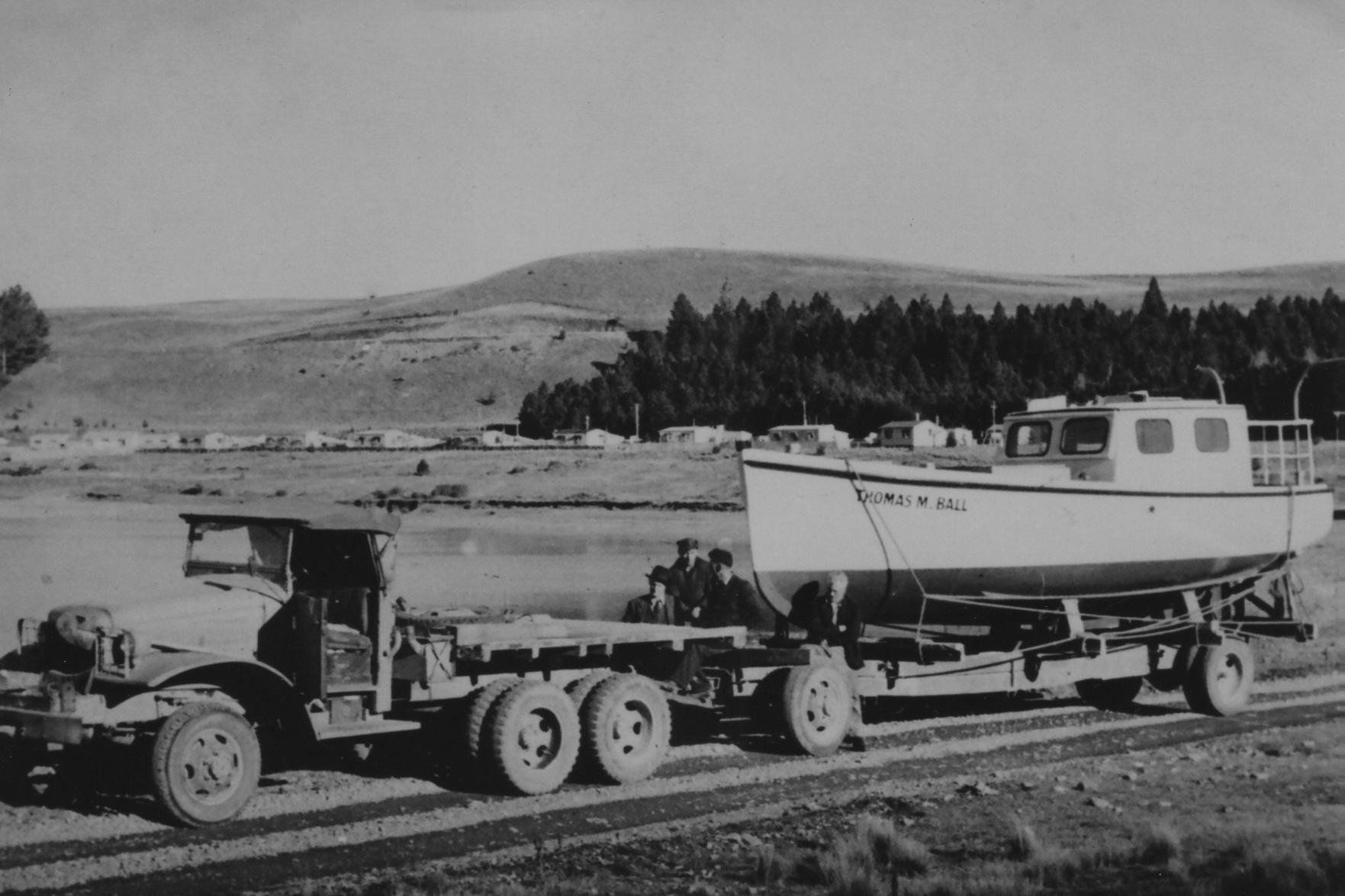 Gilbert Guard, Dick Guard and Stan Guard launching “My Poppa” on Lake Tekapo 1961-1962